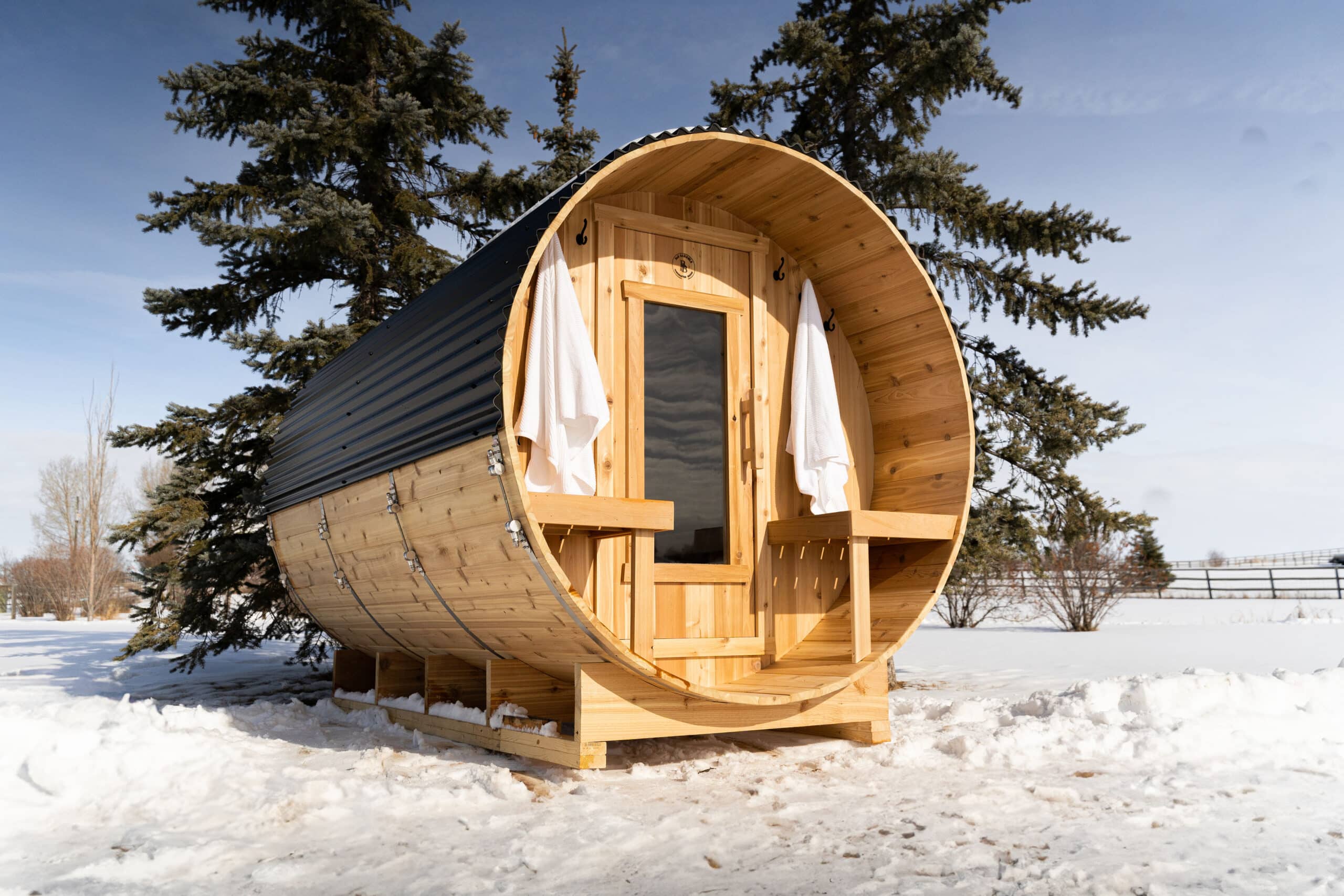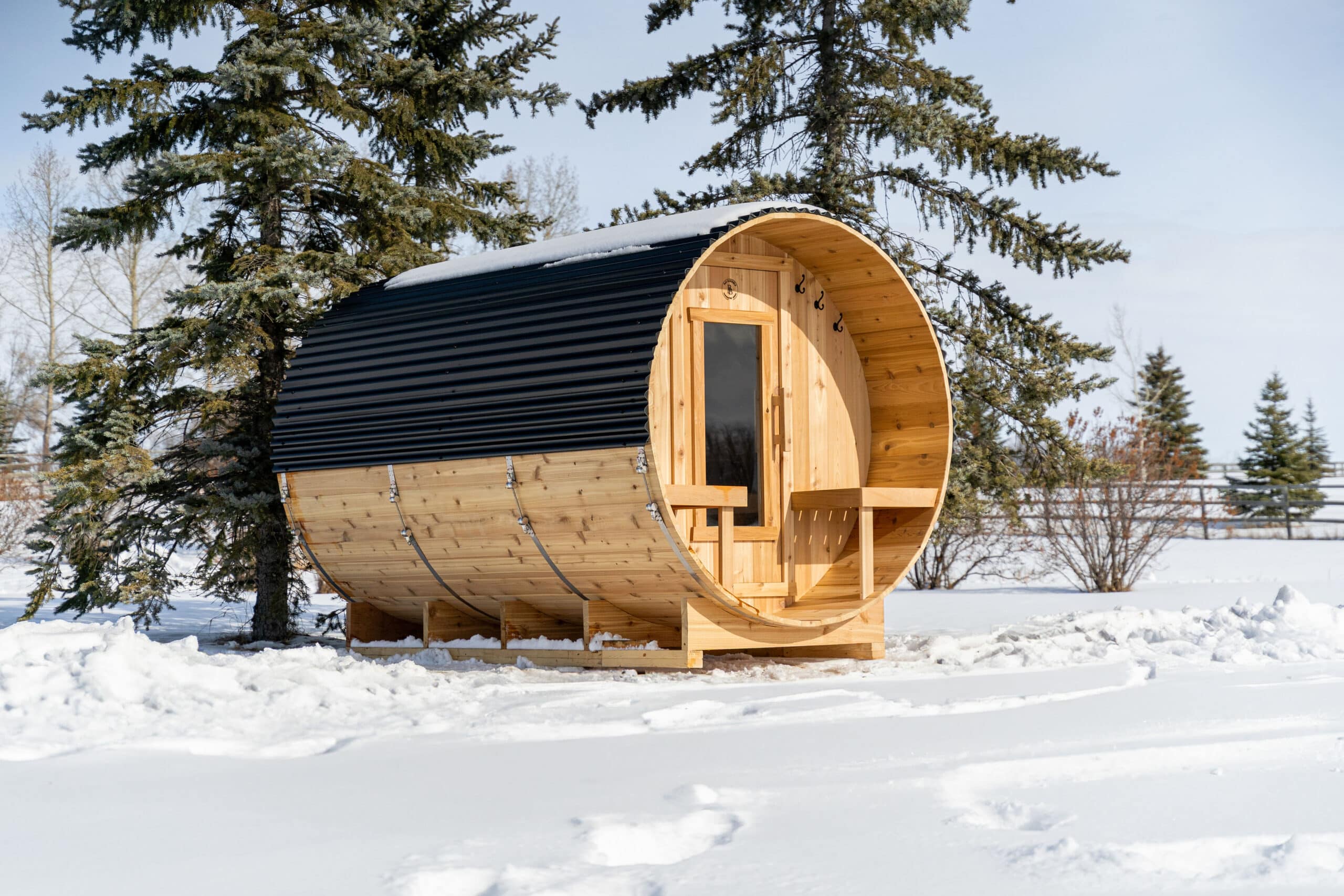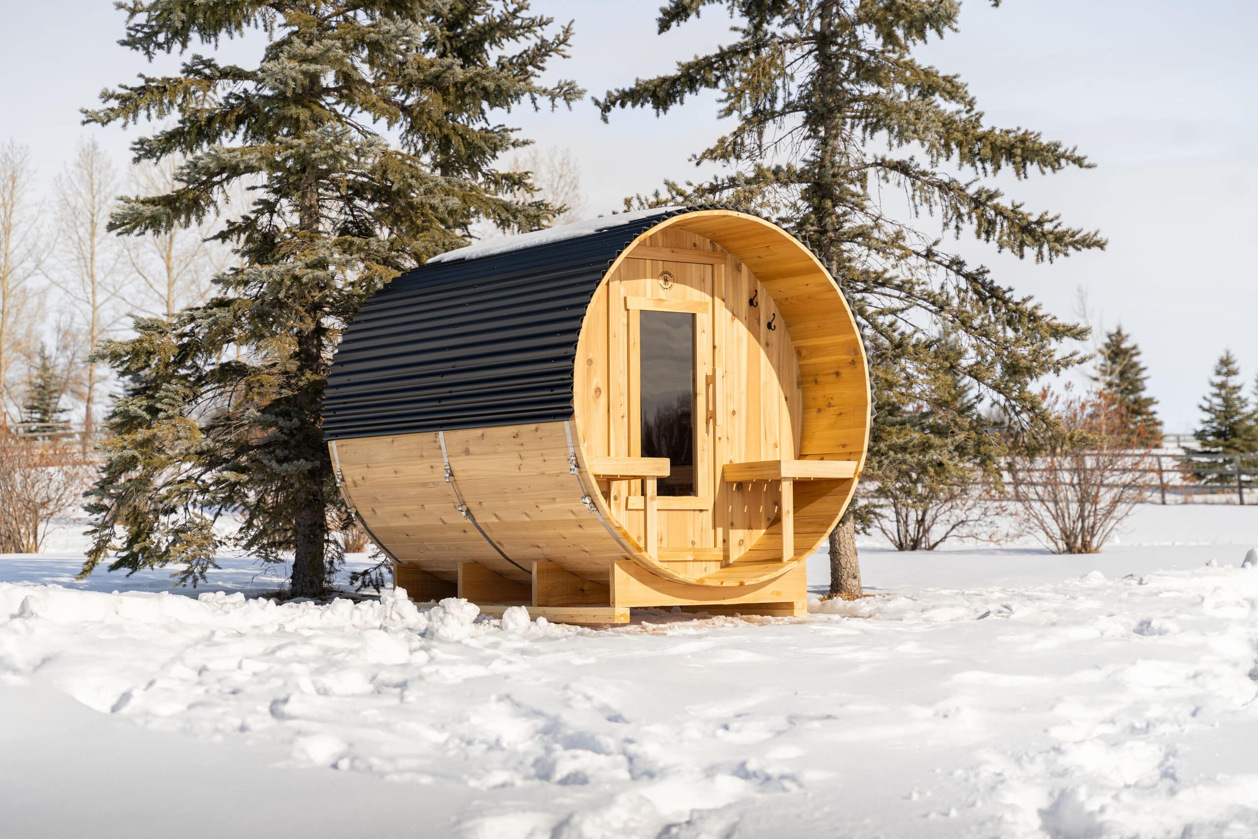 Our saunas are built to last featuring a robust, attractive cedar barrel design with a 26-gauge black metal roof to withstand the elements.